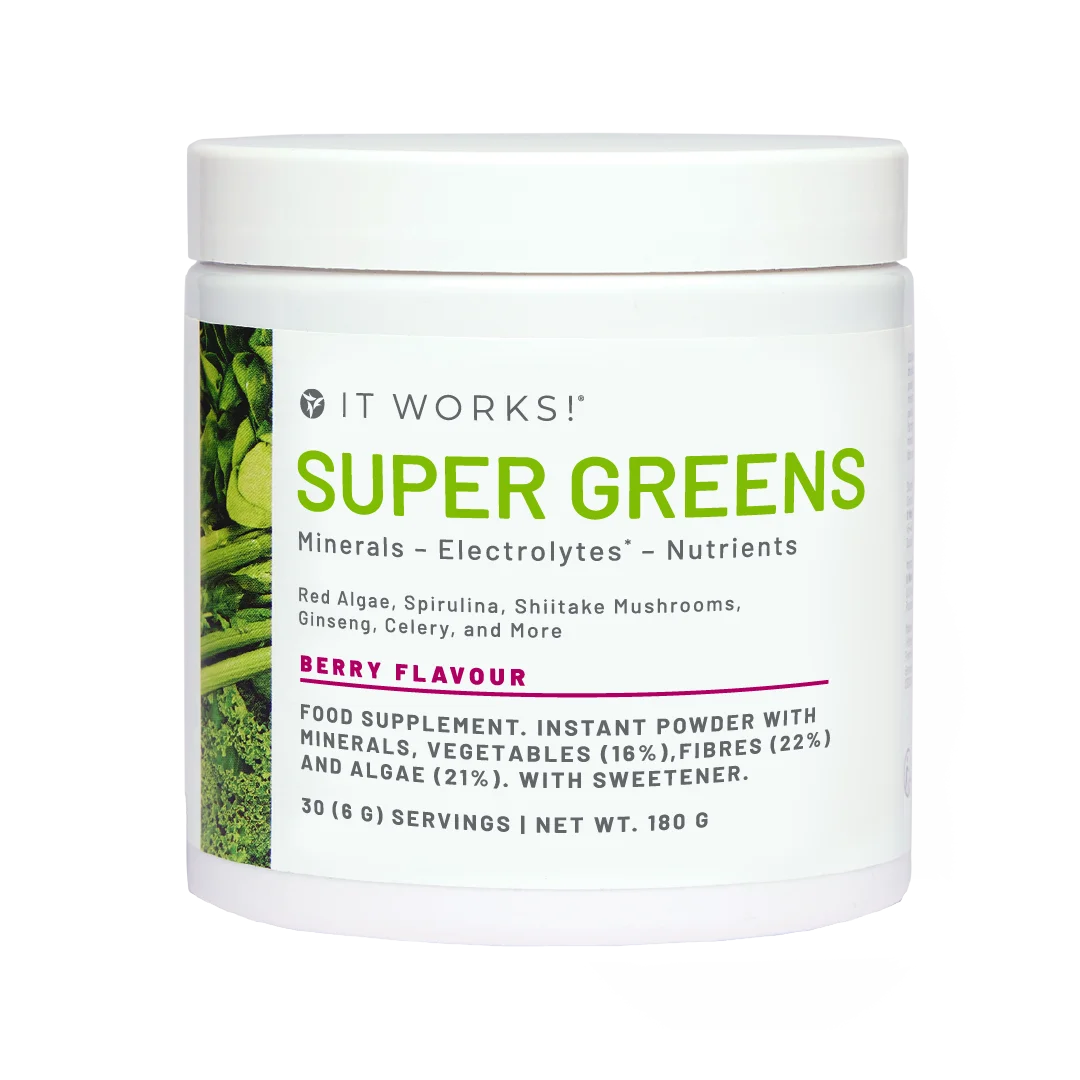 IT WORKS! Super Greens łączy w sobie to, co najlepsze z lądu i morza, zawierając warzywa, algi i roślinne superfoods w gęstej pod względem składników odżywczych formule, bogatej w błonnik. Dzięki codziennemu uzupełnieniu minerałów, IT WORKS! Super Greens – wspiera zdrowe trawienie* oraz zmniejsza uczucie zmęczenia i znużenia**. Ponadto, jego dekadencki smak czekolady oferuje wyjątkowo pyszny sposób na korzystanie z dobrodziejstw warzyw. Ciesz się tym boskim napojem, który korzystnie wpływa na Twoje ciało każdego dnia!